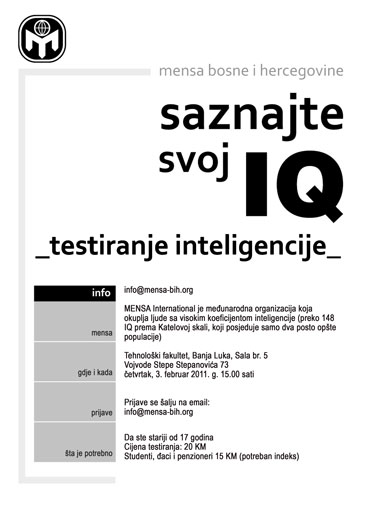 Jubilarni deseti put Mensa Beograda vas poziva da se u vreme Beer festa www.belgradebeerfest.com družimo u Beogradu. U skladu sa preporukom Mense International da se akcenat u organizaciji aktivnosti svake nacionalne Mense stavi na rad sa (darovitom) decom, ove godine smo se odlučili za niz aktivnosti u kojima mogu da učestvuju i deca. Naravno, dobrodošli su i oni koji su se samo osećaju kao (večita) deca! J Termin okupljanja je 16. do 18. avgusta 2013. Ali, za probijanje leda, nudimo i jedno kuglaško nadmetanje u četvrtak 15.08.2013.